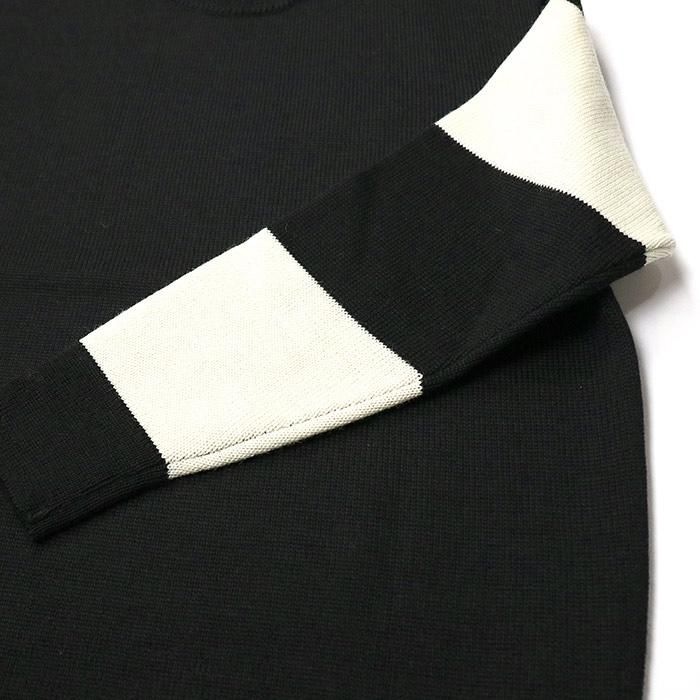 ローゲージのウール糸で編み立てたSleeve Border Knit Sweater。