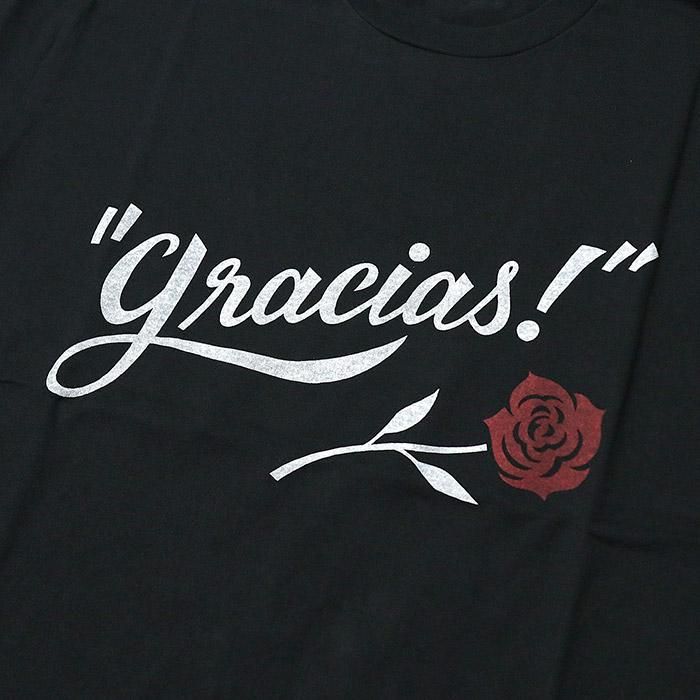 フロントに “グラシアス!” とバラのグラフィック。バックにはラベルロゴがラバープリントでデザインされています。
