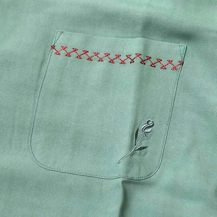 20のレーヨン糸を使い織り上げた平織りのオリジナルレーヨン生地を使用したオープンカラータイプのレーヨンシャツ。