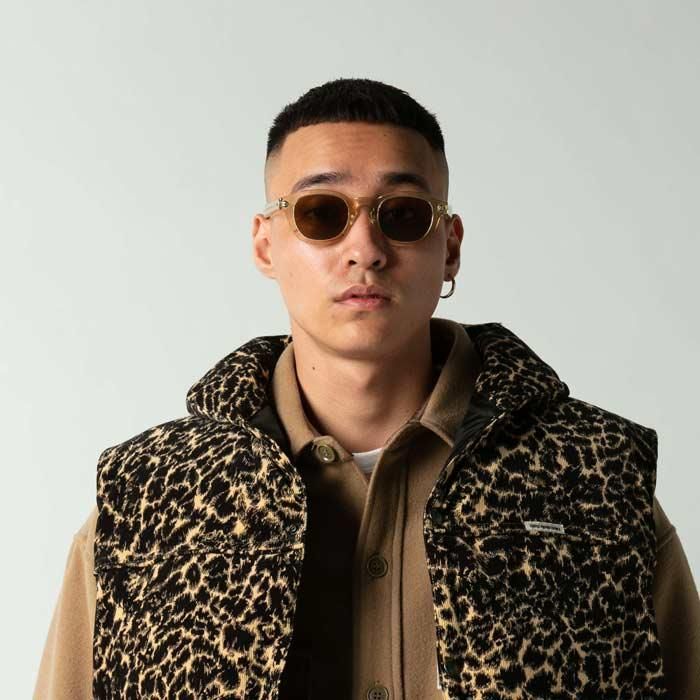 厚みのあるフレームはブラックと黄色みのあるクリアフレームの2種類でそれぞれに異色のカラーレンズが入る。