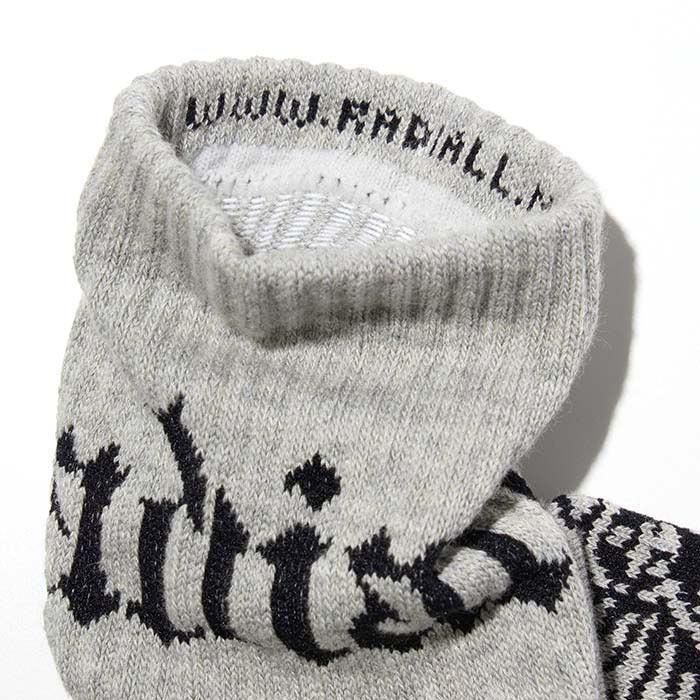 ジャガードで足裏に「RADIALL」、甲に「レコードマリア」、履き口裏に「WWW.RADIALL.NET」、足底に「KEYSTONE CALLING」が入ります。