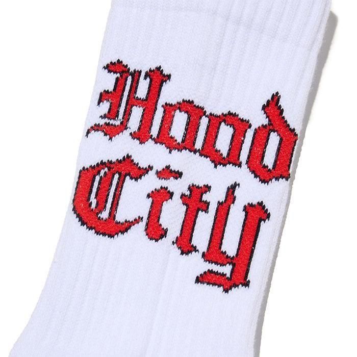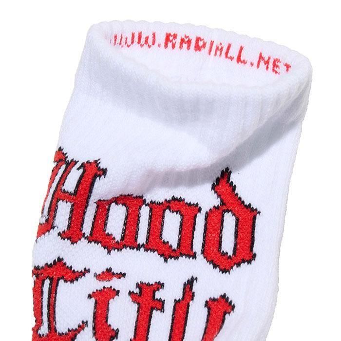 ジャガードでふくらはぎ側に「HOOD CITY」、履き口裏に「WWW.RADIALL.NET」、足底に「KEYSTONE CALLING」が入ります。