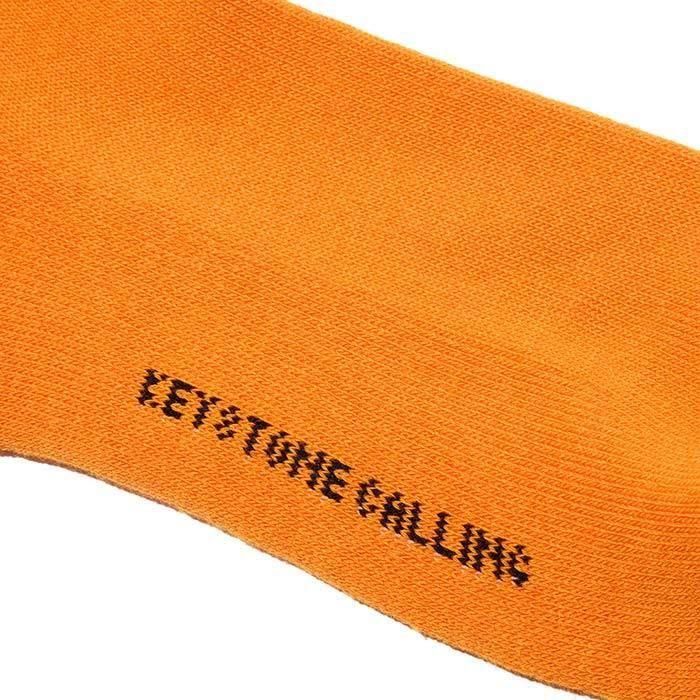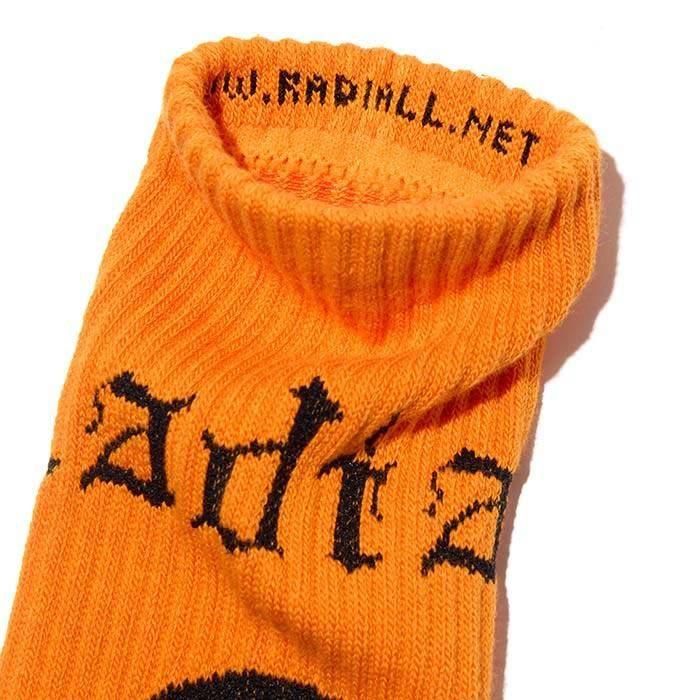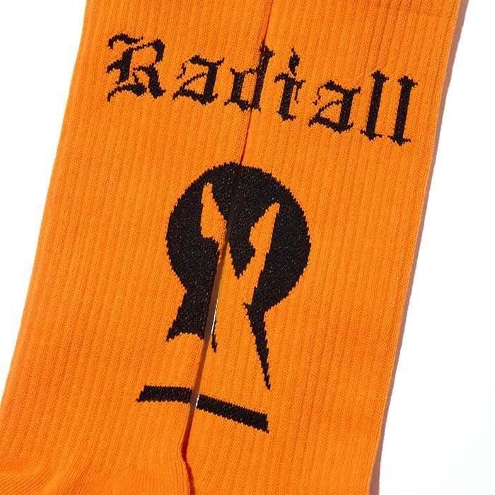 ジャガードでふくらはぎ側に「キーホール」、履き口裏に「WWW.RADIALL.NET」、足底に「KEYSTONE CALLING」が入る。