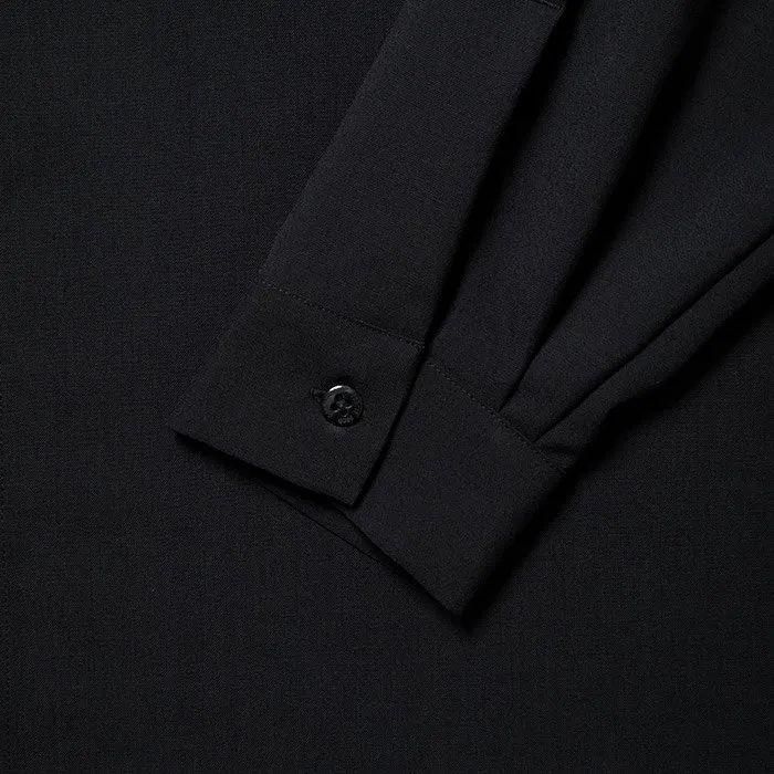 光沢とドレープが特徴のウールとポリエステル混紡のウォッシャブル平織生地を使用。